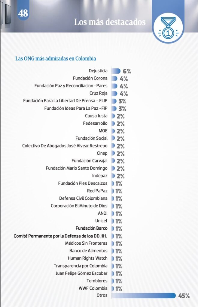 Ocupamos el tercer lugar en este listado, nada mal. Según los registros de cámara de comercio en Colombia hay 400 mil ONG registradas. Estar referenciada por los líderes de opinión ya es un mérito, pero estar en el Top 3, al lado de De Justicia, la fundación Corona, la Cruz Roja es motivante. Aprovechamos para destacar el trabajo de otras fundaciones reconocidas en este panel de opinión como la FIP, la FLIP, o la MOE. Esto nos emociona y nos llena de responsabilidades: tenemos la obligación de hacer un mejor trabajo para ayudar a que la sociedad colombiana sea más justa, más igualitaria, más comprometida con el respeto a los Derechos Humanos.