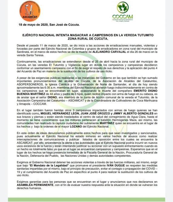 La Asociación Campesina del Catatumbo (ASCAMCAT) y la Coordinadora Municipal de Cultivadores de Coca, Amapola y Marihuana (COCCAM) denunciaron este lunes el asesinato del campesino Emérito Digno Buendía Martínez a manos de uniformados del Ejército colombiano. De acuerdo con ASCAMCAT, el hecho ocurrió a las 6:30 a.m. cuando hombres del ejército abrieron fuego en contra del asentamiento campesino ubicado en la vereda Tutumito, zona rural de Cúcuta (Norte de Santander).