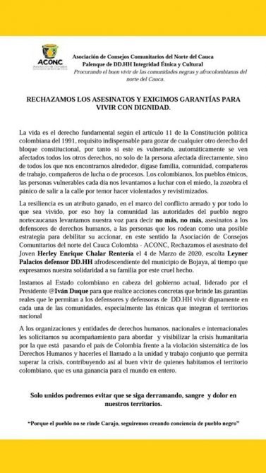 Comunicado de la Asociación de Consejos Comunitarios del Norte del Cauca.