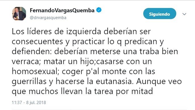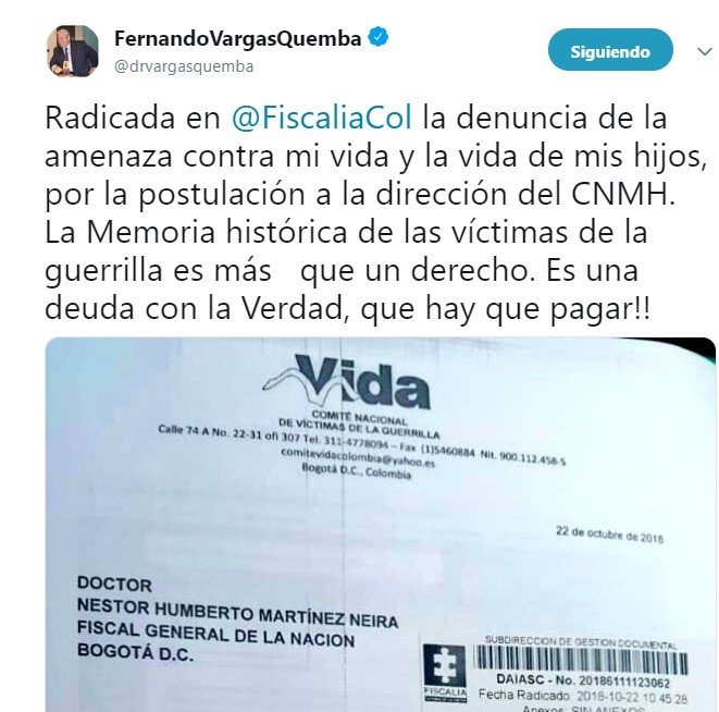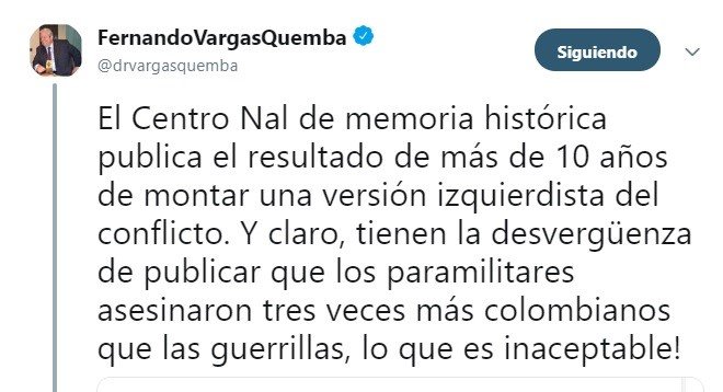 Así las cosas, surge como gran preocupación el hecho de que las valoraciones ideológicas de Vargas Quemba incidan sobre los futuros informes y estudios del CNMH y sobre su misma vocación. Pues todo parece indicar queVargas Quemba quiere quitarle un pedazo a la historia . Así lo ha demostrado en algunos trinos: