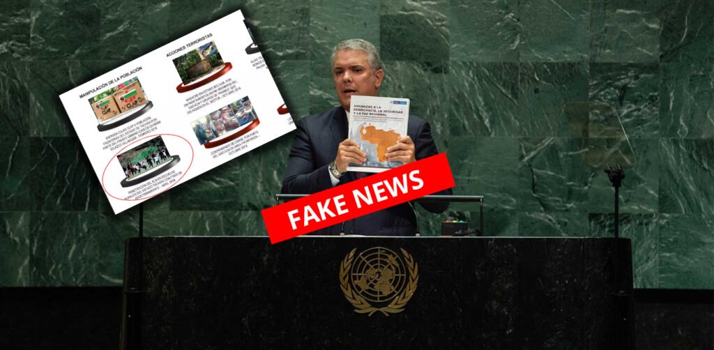 El presidente Iván Duque, en su afán de hostigar el régimen de su homólogo venezolano con quien tiene rotas las relaciones desde el mes de febrero, presentó el jueves un informe ante las Naciones Unidas en el cual enseñó una foto del ELN supuestamente reclutando a menores de edad en territorio venezolano, sin embargo, resultó ser falsa.