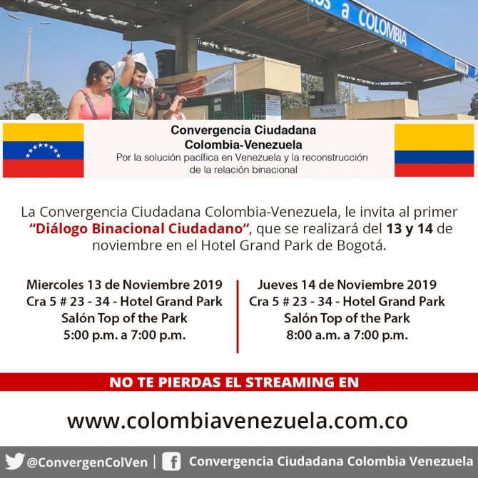 Este miércoles 13 de noviembre, en el centro de Bogotá, se realizará a las 5 p.m. el lanzamiento de la la Convergencia Ciudadana Colombia-Venezuela. Esta es una apuesta plural y diversa a favor de una diplomacia ciudadana binacional y regional, que busca articular y multiplicar iniciativas para apoyar los diálogos y acuerdos entre los distintos sectores sociales y políticos en favor de una salida política y pacífica en Venezuela, así como para tender puentes entre las dos naciones. El jueves 14 de noviembre, desde las 8:30 a.m. se realizarán los paneles de diálogo abierto con expertos y académicos de ambas naciones.