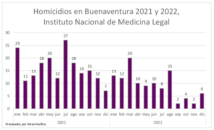 En la nueva ola de violencias vividas en Buenaventura, los meses de enero, mayo y julio fueron los más violentos de ese año (2021) con cifras de 20 homicidios y más; el mes de julio fue el más violento con 27 homicidios, casi un homicidio diario. También, como desde la Oficina Pares Pacífico se ha insistido, en 2021 la guerra urbana era la de más víctimas: 9 de cada 10 homicidios ocurrieron en la zona urbana de Buenaventura en medio de constantes enfrentamientos entre dichos grupos armados, así como el establecimiento de las denominadas fronteras invisibles.