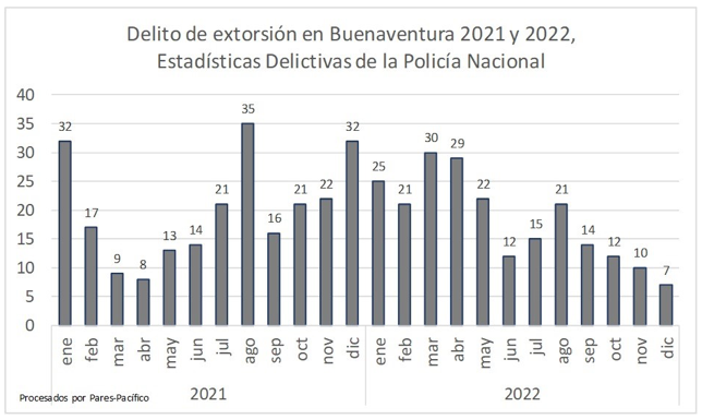 Las extorsiones que aquejan al sector comercial en Buenaventura han sido constantes. En varios escenarios el gremio de comerciantes ha manifestado preocupación dado que están expuestos a cerrar sus negocios ante el miedo de no poder cumplir las exigencias económicas. Frente a esto, en muchos casos, no se hacen las respectivas denuncias por lo que se presume un alto subregistro. No obstante, el número de casos de extorsiones reportadas ante la Policía Nacional para el año 2021 fue de 240, siendo los meses de enero, agosto y diciembre los más graves, superando los 30 casos.