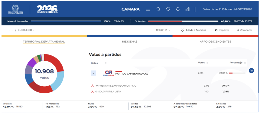 De acuerdo con los resultados electorales del municipio, Leonardo Rico fue el candidato con mayor votación en El Colegio, sin embargo, debido a que su partido, Cambio Radical no alcanzó el umbral, no obtuvo la curul pese a tener más de 40 mil votos en todo el departamento.