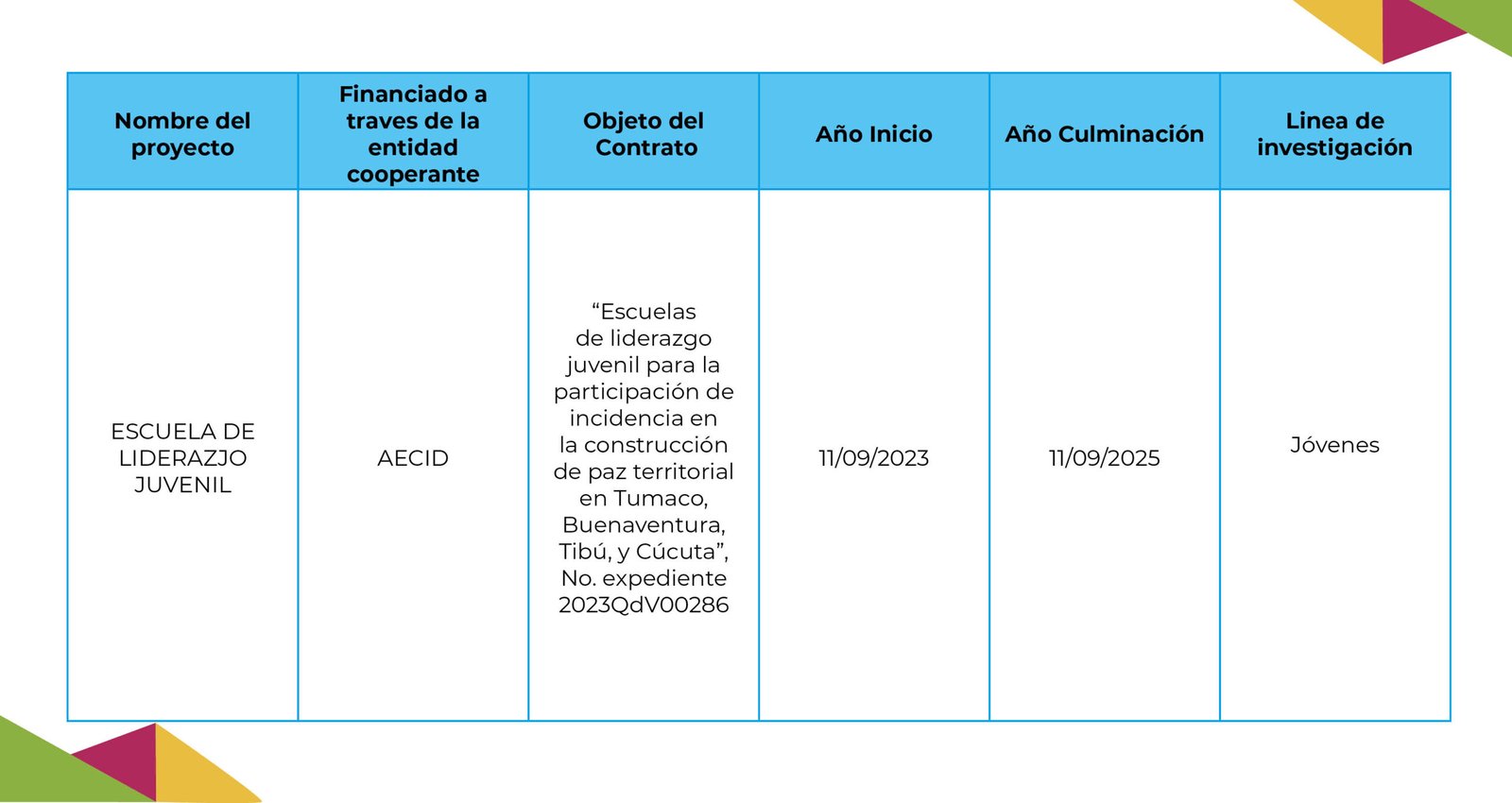 ESCUELA DE LIDERAZJO JUVENIL“Escuelas de liderazgo juvenil para la participación de incidencia en la construcción de paz territorial en Tumaco, Buenaventura, Tibú, y Cúcuta”, No. expediente 2023QdV00286 Año Inicio: 11/09/2023 Año Culminación: 11/09/2025 Linea de investigación: Jóvenes
