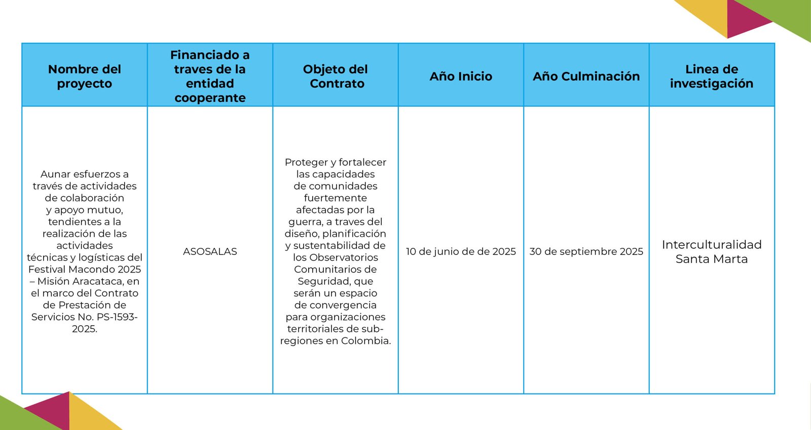 Aunar esfuerzos para desarrollar las actividades técnicas y logísticas del Festival Macondo 2025 – Misión Aracataca, en el marco del Contrato de Servicios No. PS-1593-2025.Proteger y fortalecer las capacidades de comunidades fuertemente afectadas por la guerra, a traves del diseño, planificación y sustentabilidad de los Observatorios Comunitarios de Seguridad, que serán un espacio de convergencia para organizaciones territoriales de sub-regiones en Colombia. Año Inicio: 10 de junio de de 2025 Año Culminación: 30 de septiembre 2025 Linea de investigación: Interculturalidad Santa Marta