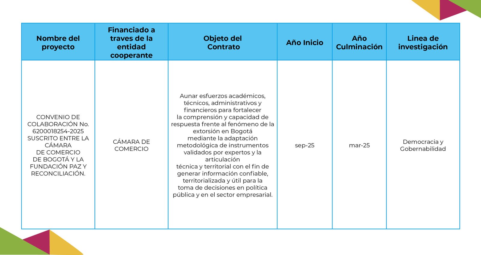 Convenio de Colaboración No. 6200018254-2025 entre la Cámara de Comercio de Bogotá y la Fundación Paz y Reconciliación.Aunar esfuerzos académicos, técnicos, administrativos y financieros para fortalecer la comprensión y capacidad de respuesta frente al fenómeno de la extorsión en Bogotá mediante la adaptación metodológica de instrumentos validados por expertos y la articulación técnica y territorial con el fin de generar información confiable, territorializada y útil para la toma de decisiones en política pública y en el sector empresarial. Año Inicio: sep-25 Año Culminación: mar-25 Linea de investigación: Democracia y Gobernabilidad