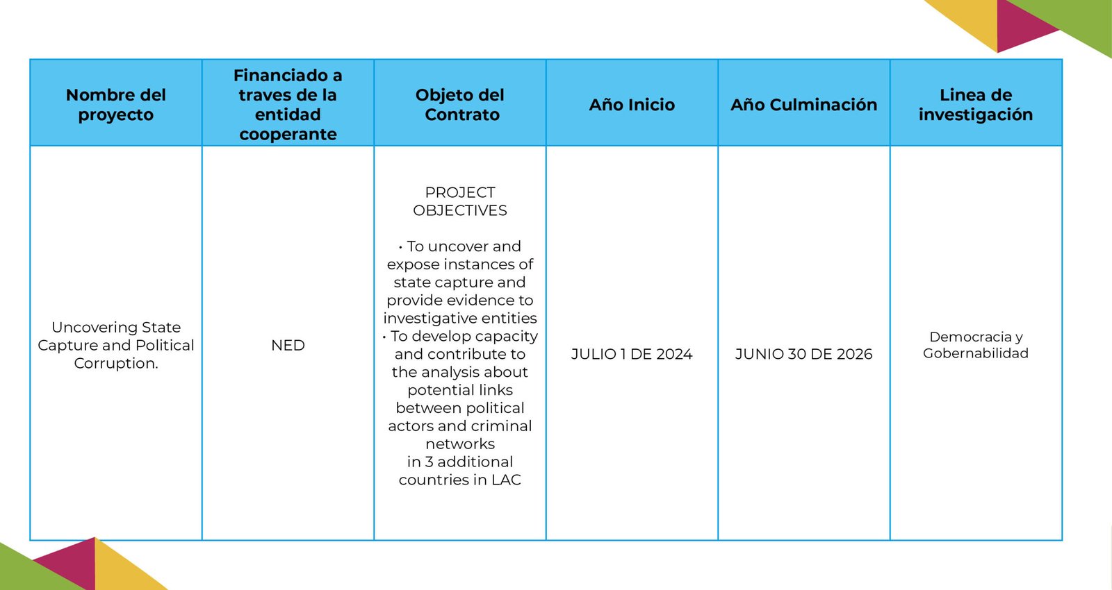Uncovering State Capture and Political Corruption.• To uncover and expose instances of state capture and provide evidence to investigative entities • To develop capacity and contribute to the analysis about potential links between political actors and criminal networks in 3 additional countries in LAC Año Inicio: JULIO 1 DE 2024 Año Culminación: JUNIO 30 DE 2026 Linea de investigación: Democracia y Gobernabilidad