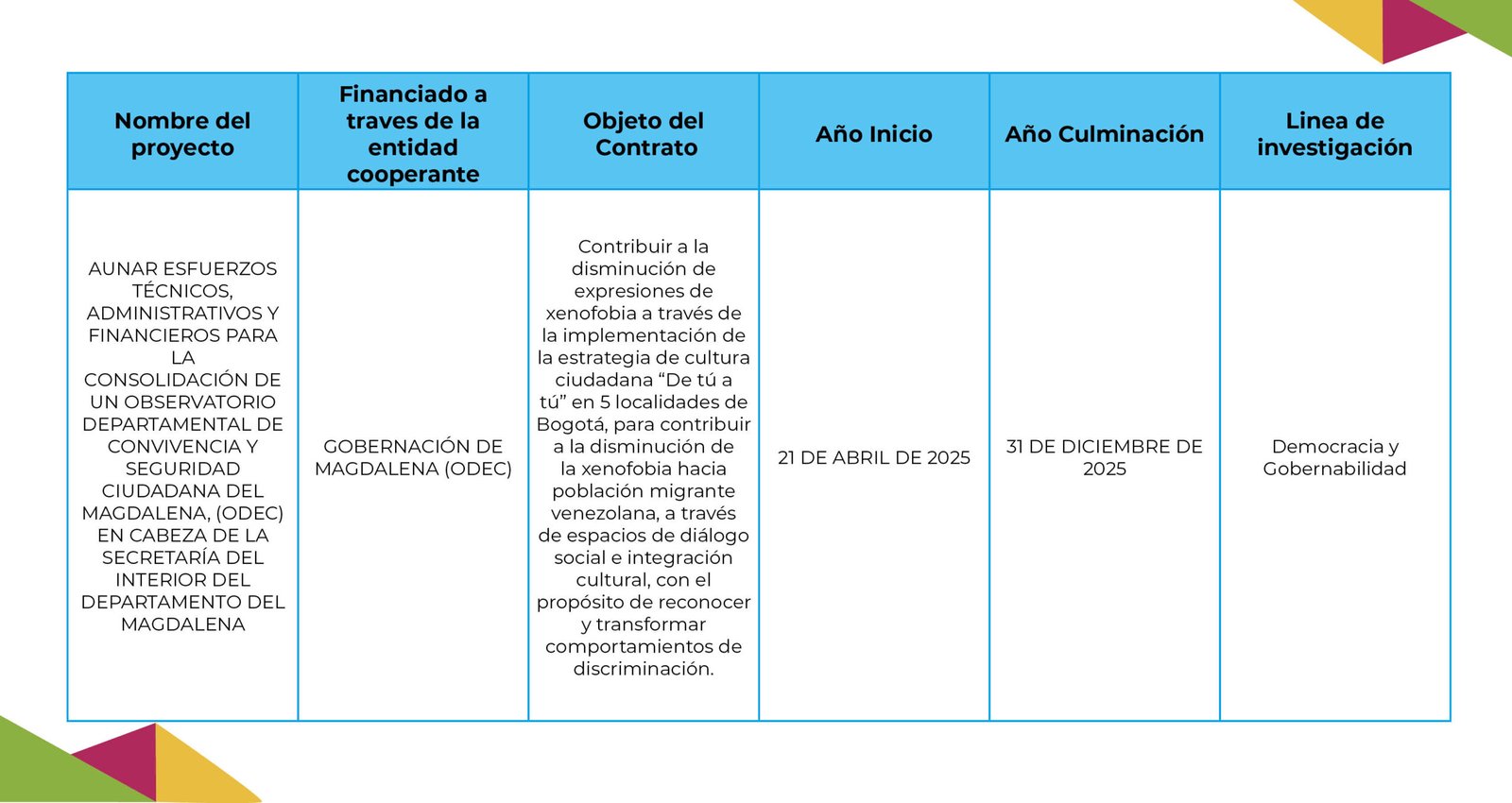Aunar esfuerzos para consolidar el Observatorio Departamental de Convivencia y Seguridad Ciudadana del Magdalena (ODEC), liderado por la Secretaría del Interior.Contribuir a la disminución de expresiones de xenofobia a través de la implementación de la estrategia de cultura ciudadana “De tú a tú” en 5 localidades de Bogotá, para contribuir a la disminución de la xenofobia hacia población migrante venezolana, a través de espacios de diálogo social e integración cultural, con el propósito de reconocer y transformar comportamientos de discriminación. Año Inicio: 21 DE ABRIL DE 2025 Año Culminación: 31 DE DICIEMBRE DE 2025 Linea de investigación: Democracia y Gobernabilidad