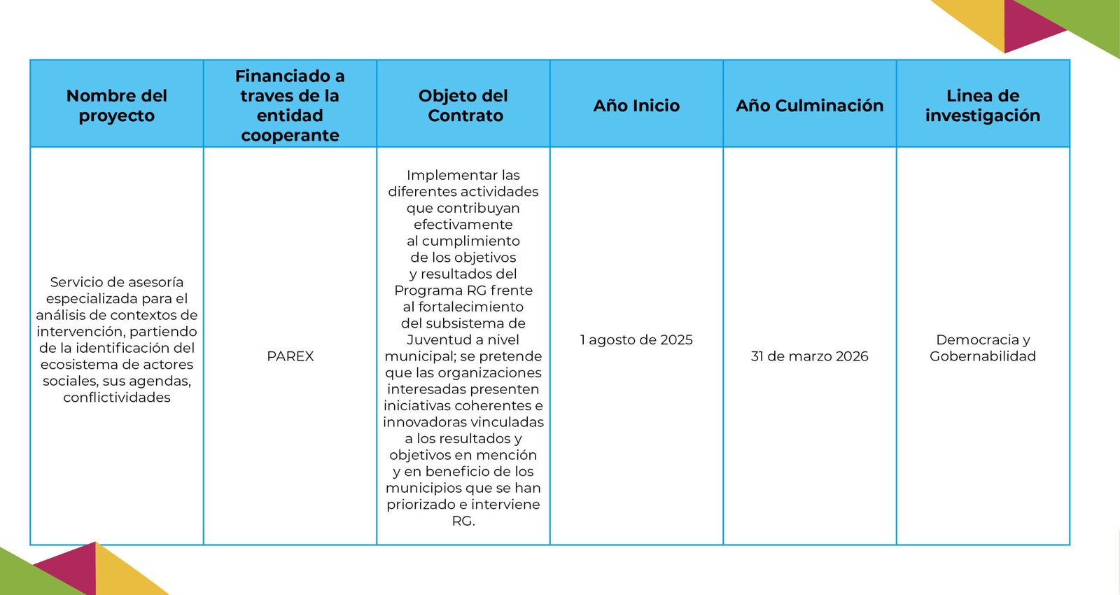 Servicio de asesoría especializada para el análisis de contextos de intervención, partiendo de la identificación del ecosistema de actores sociales, sus agendas, conflictividades.Implementar las diferentes actividades que contribuyan efectivamente al cumplimiento de los objetivos y resultados del Programa RG frente al fortalecimiento del subsistema de Juventud a nivel municipal; se pretende que las organizaciones interesadas presenten iniciativas coherentes e innovadoras vinculadas a los resultados y objetivos en mención y en beneficio de los municipios que se han priorizado e interviene RG. Año Inicio: 1 agosto de 2025 Año Culminación: 31 de marzo 2026 Linea de investigación: Democracia y Gobernabilidad