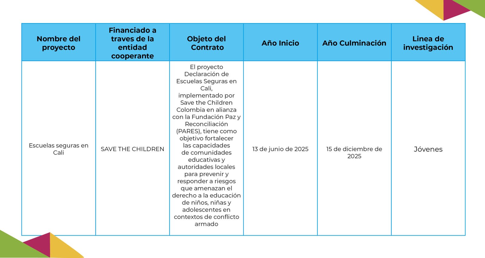 Escuelas seguras en CaliEl proyecto Declaración de Escuelas Seguras en Cali, implementado por Save the Children Colombia en alianza con la Fundación Paz y Reconciliación (PARES), tiene como objetivo fortalecer las capacidades de comunidades educativas y autoridades locales para prevenir y responder a riesgos que amenazan el derecho a la educación de niños, niñas y adolescentes en contextos de conflicto armado. Año Inicio: 13 de junio de 2025 Año Culminación: 15 de diciembre de 2025 Linea de investigación: Jóvenes