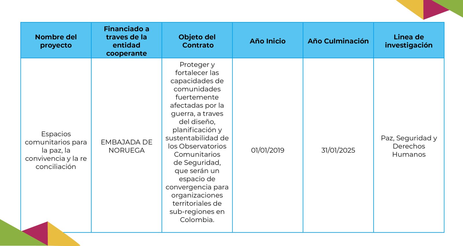Espacios comunitarios para la paz, la convivencia y la re conciliación.Proteger y fortalecer las capacidades de comunidades fuertemente afectadas por la guerra, a traves del diseño, planificación y sustentabilidad de los Observatorios Comunitarios de Seguridad, que serán un espacio de convergencia para organizaciones territoriales de sub-regiones en Colombia. Año Inicio: 01/01/2019 Año Culminación: 31/01/2025 Linea de investigación: Paz, Seguridad y Derechos Humanos