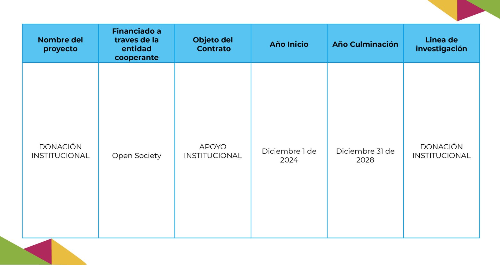DONACIÓN INSTITUCIONALAPOYO INSTITUCIONAL Año Inicio: Diciembre 1 de 2024 Año Culminación: Diciembre 31 de 2028 Linea de investigación: DONACIÓN INSTITUCIONAL
