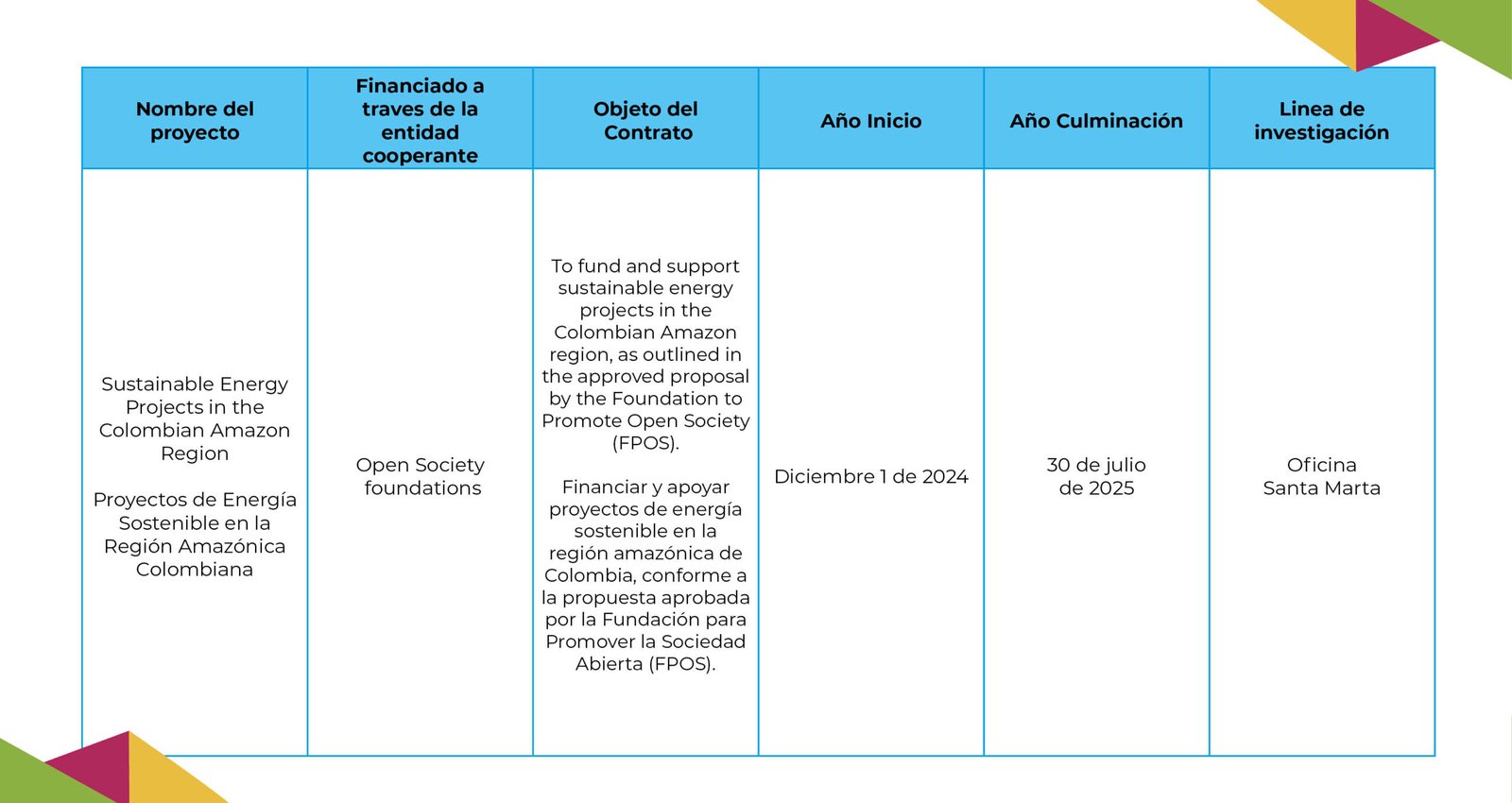 Sustainable Energy Projects in the Colombian Amazon Region Proyectos de Energía Sostenible en la Región Amazónica Colombiana.Financiar y apoyar proyectos de energía sostenible en la región amazónica de Colombia, conforme a la propuesta aprobada por la Fundación para Promover la Sociedad Abierta (FPOS). Año Inicio: Diciembre 1 de 2024 Año Culminación: 30 de julio de 2025 Linea de investigación: Oficina Santa Marta