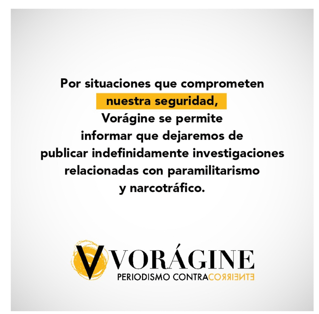 Nicolás Sánchez Arévalo, periodista de Vorágine, fue objeto de amenazas de muerte debido a sus investigaciones sobre vínculos empresariales con el paramilitarismo y el narcotráfico. El 9 de octubre de 2024, según el director del medio, José Guarnizo , Sánchez recibió una amenaza directa que fue calculada, explícita y abierta contra él y sus familiares, lo que llevó a Vorágine a suspender indefinidamente la publicación de investigaciones relacionadas con estos temas, del mismo modo que expresó su preocupación por el ambiente hostil que enfrentan los periodistas, subrayó la importancia de la solidaridad de colegas y organizaciones en estos momentos críticos y señaló la urgencia de evitar normalizar la violencia frente a la labor del periodismo.