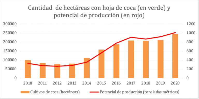 Cabe recordar que, a diferencia de lo afirmado por Naciones Unidas y el Gobierno Duque, la Casa Blanca concluyó que la cantidad de hectáreas con hoja de coca aumentó un 15% para 2020, llegando a 245.000 hectáreas.