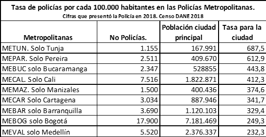 Frente a esta situación, además de aplicar las propuestas anteriores, hay que racionalizar los servicios de policía y distribuirlos de acuerdo con los problemas de violencia y delincuencia, como lo propuse en el artículo anterior. A manera de ejemplo, como lo muestra el siguiente cuadro, no se entiende la distribución de los policías en las Áreas Metropolitanas.