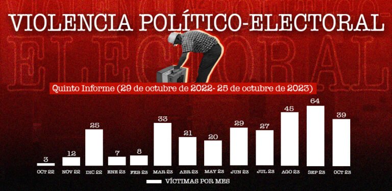 Durante el periodo de tiempo analizado, se registraron 325 víctimas de violencia electoral en 262 hechos asociados. Del total de víctimas (325), treinta y siete (37) fueron asesinadas, cincuenta y uno (51) sufrieron un atentado y 236 fueron amenazadas. En relación con el informe inmediatamente anterior (Ver:Cuarto informe de violencia político-electoral [29 octubre 2022 – 29 agosto 2023 ]), correspondiente a los primeros diez meses del calendario electoral (del 29 de octubre de 2022 al 29 de agosto de 2023), se dio un incremento del 8,82% en el número de homicidios registrados, y del 62,5% en el número de atentados.