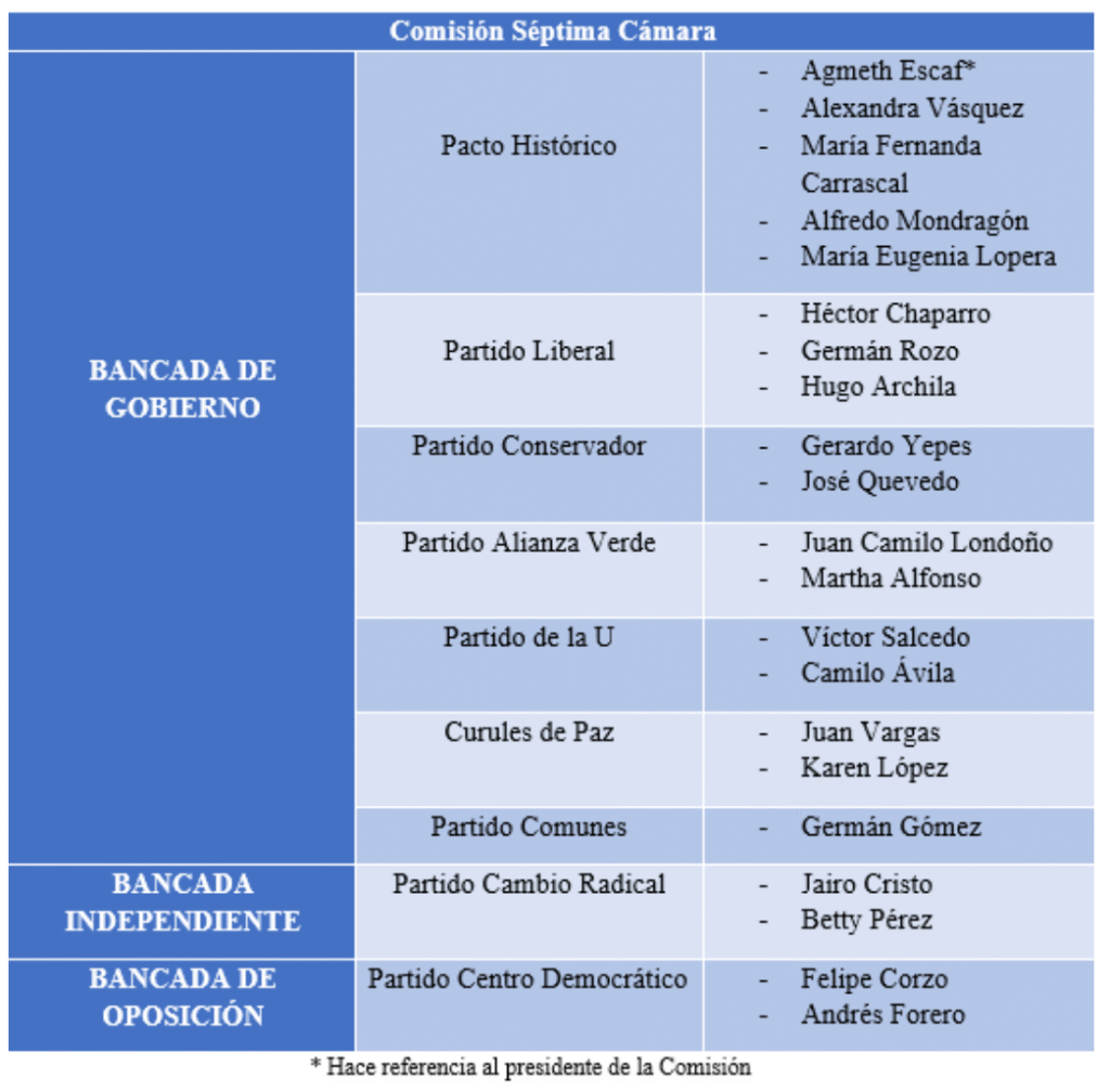 Respecto a la composición de donde será la primera gran prueba de fuego en el Congreso para la reforma, es decir, las comisiones séptimas, en Cámara está compuesta por 21 congresistas, 17 hacen parte de la bancada de gobierno, dos son independientes y dos son oposición. Y en Senado son 14 congresistas, 10 son de gobierno, dos son independientes y dos son oposición