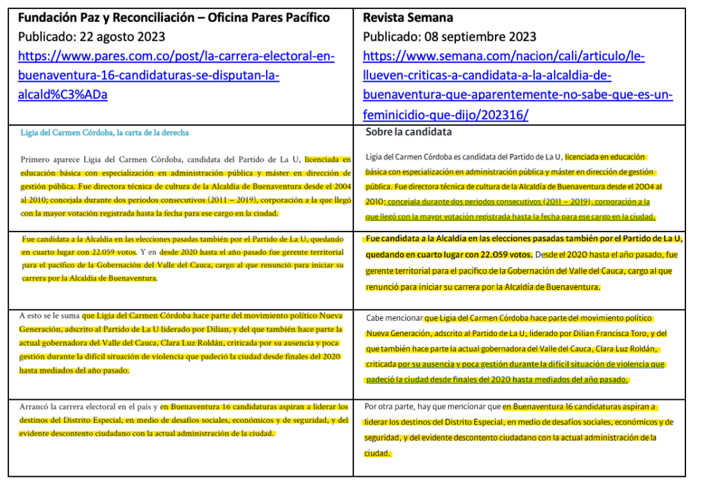 La Revista Semana copió varios párrafos enteros de un texto de la Oficina Pares Pacífico de la Fundación Paz & Reconciliación (Pares) al presentar una noticia sobre la candidata a la Alcaldía de Buenaventura, Ligia del Carmen Córdoba.