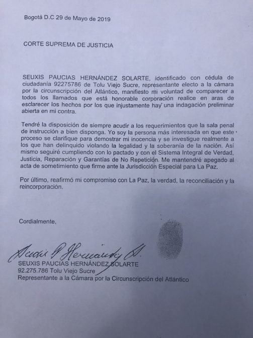 En la mañana de este jueves, el equipo jurídico de Santrich había radicado en al Corte Suprema de Justicia la manifestación de voluntad de Jesús Santrich, firmada por él mismo, de comparecer a los llamados que le haga esta Corte.