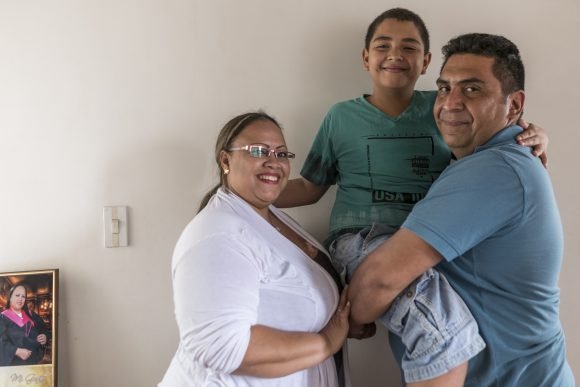 La familia de Sandra en la sala de su casa. Ella, su hijo Mauricio y su esposo Adrián. Al Extro Izquierdo una foto de Sandra en su grado.