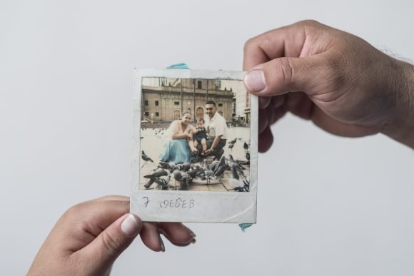 Sandra y Adrián sostiene una foto de la familia cuando Mauricio tenía 7 meses