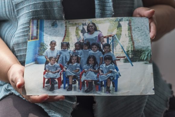 Sandra sostiene una foto de su etapa como profesora