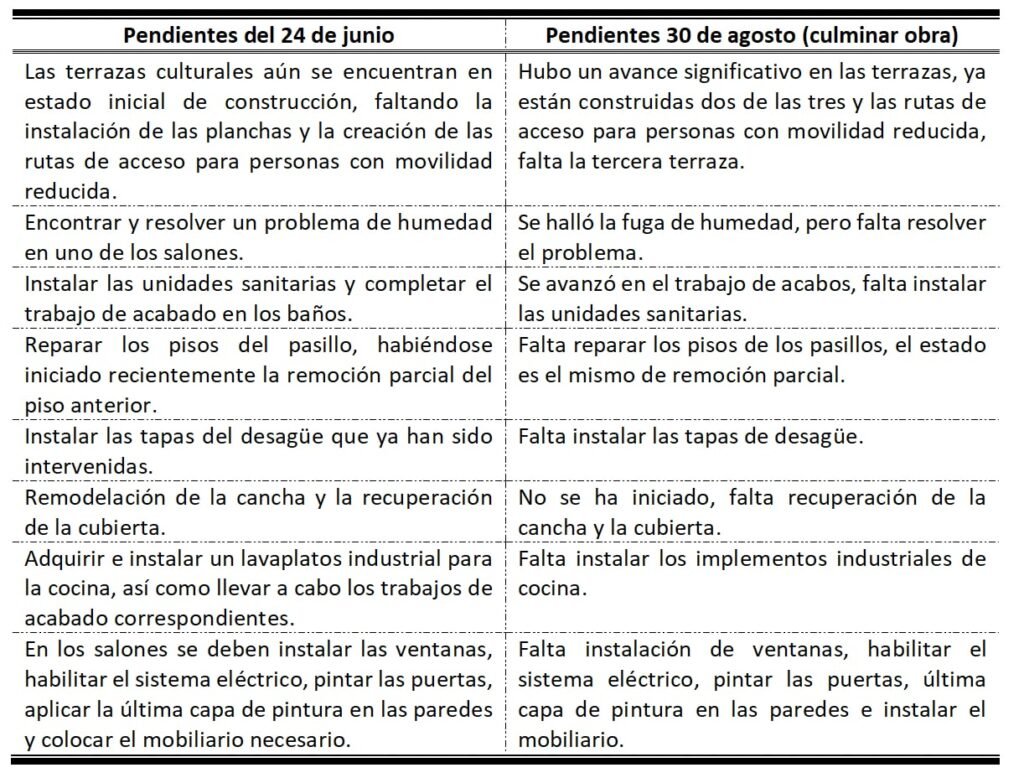 Por eso se hace el siguiente cuadro comparativo de los pendientes del 24 de junio a los evidenciados el 30 de agosto y que faltan para culminar completamente la obra: