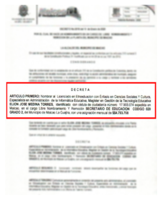 El secretario de educación de Maicao estaría presuntamente inhabilitado para ejercer el cargo, pero han pasado dos años desde que fue nombrado y continúa en él. Esto, teniendo en cuenta que, al estar intervenido el departamento y el municipio, el secretario no tenía facultades para la gestión del sector educativo, por lo que su nombramiento podría generar detrimento patrimonial.