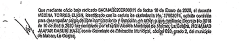 Además, se hace el llamado a que el proceso de la comisión se dio en un solo día, dando paso a errores y desaciertos que podrían implicar un detrimento patrimonial “dado que cuando se realizó el nombramiento de marras, la educación en el departamento de La Guajira y específicamente del municipio de Maicao, se encontraban intervenida por la Asunción Temporal de Funciones por la DAF (Dirección de Apoyo Fiscal) del Ministerio de Hacienda y Crédito Público, mediante la Resolución 0459 del 21 de febrero de 2017”.