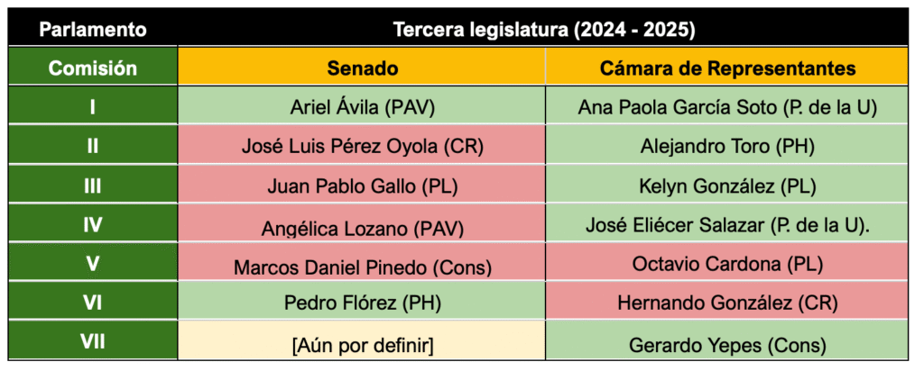 Aunque para el momento en el que se escribió este artículo aún no se había elegido la mesa directiva de la comisión séptima de Senado, en Cámara fue elegido Gerardo Yepes, del partido Conservador, quien es cercano al gobierno nacional.