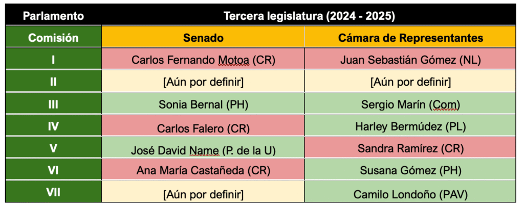 Por ahora, en Cámara, el gobierno tiene el control de 5 de las 7 comisiones. Frente a la conformación partidaria de las mesas directivas de la Cámara de Representantes, 3 presidencias quedaron en manos del bloque de gobierno (1 del Partido Verde; 1 del Pacto Histórico y 1 del Partido Liberal), 2 presidencias quedaron en manos de los partidos independientes cercanos al gobierno (2 del Partido de la U), y 1 en manos del Partido Liberal que en la práctica es lejano al gobierno. Si los acuerdos se cumplen en la comisión séptima, la presidencia de esta bancada debería quedar en manos de los conservadores cercanos al gobierno.