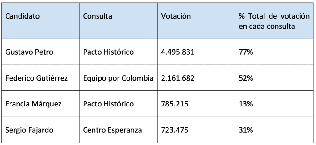 Aunque la Coalición Centro Esperanza ha demostrado ser una tercería viable frente a la disyuntiva entre los candidatos Gustavo Petro y Federico Gutiérrez, lo cierto es que no logró subir en las encuestas para competir y asegurar su llegada a una segunda vuelta. Esto, en principio, tras los resultados obtenidos en la consulta presidencial, en la que obtuvieron2.287.603 votos, que representaron solamente el 22,47% de la votación total de las consultas. Sergio Fajardo no alcanzó ni a la tercera votación más alta, obtenida por Francia Márquez con 785.215 votos. 9dd0e1