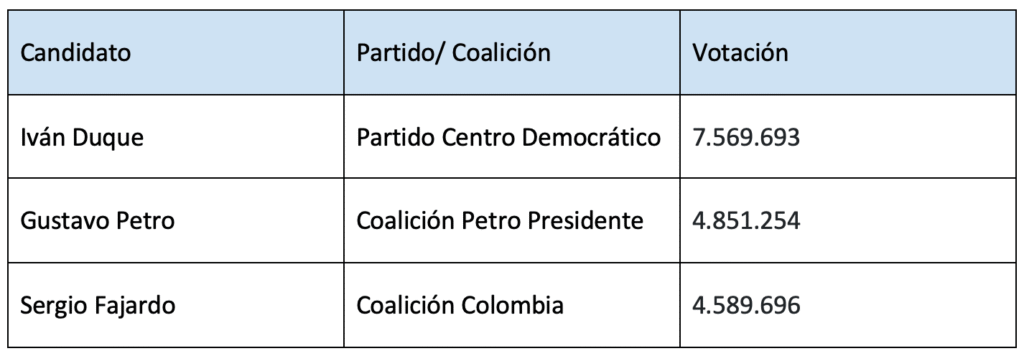 Votaciones presidenciales 2018 primera vuelta. Creado por: Línea de Democracia y Gobernabilidad. Fundación Paz & Reconciliación. Fuente: Registraduría Nacional del Estado Civil.