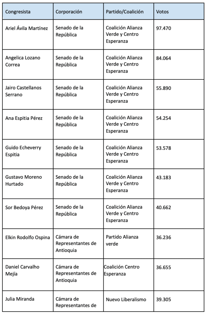 Ahora bien, a pesar de que estos candidatos electos pertenezcan a los partidos y/o fracciones de partidos que respaldan a Sergio Fajardo en su campaña a la presidencia de la República, esto no significa que ellos o ellas compartan esa aspiración, especialmente en el partidoAlianza Verde , donde hay libertad de militancia para estas elecciones. Conforme a las investigaciones de Pares, los candidatos electos según el conteo preliminar de la Registraduría que respaldan abiertamente a Sergio Fajardo son 7 senadores y 8 representantes a la Cámara.