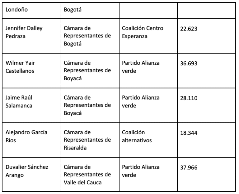 Congresistas electos que apoyan a Sergio Fajardo . Creado por: Línea de Democracia y Gobernabilidad. Fundación Paz & Reconciliación. Fuente: Registraduría Nacional del Estado Civil.
