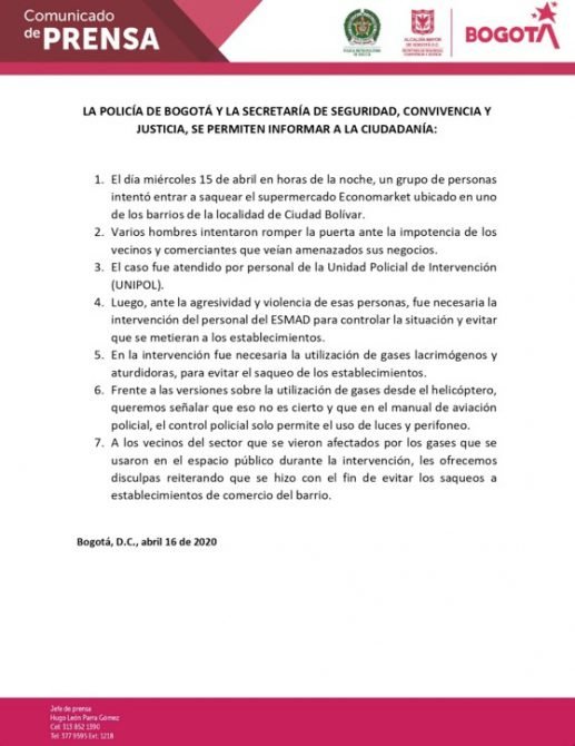 Comunicado emitido por la Alcaldía Mayor de Bogotá. Abril 16 de 2020.