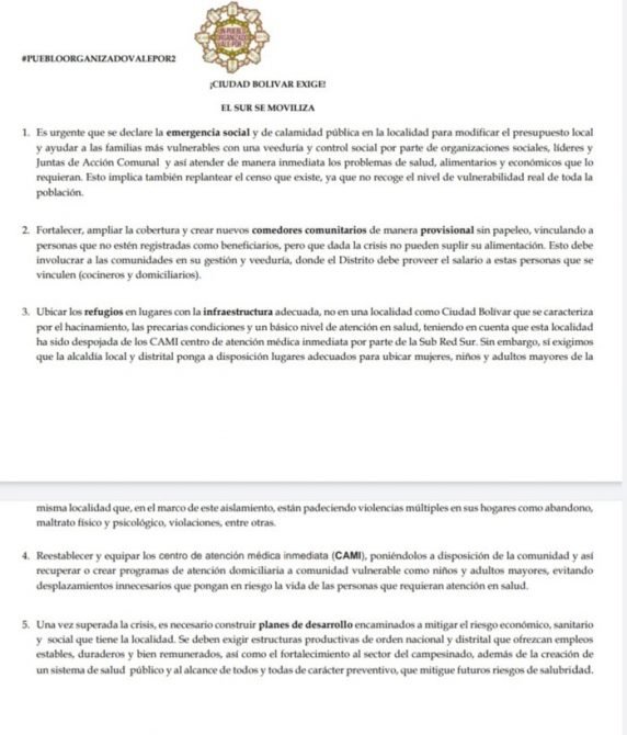 Sectores de Ciudad Bolívar han solicitado que en la localidad se decrete la emergencia social y la calamidad pública con lo cual esperan, entre otras cosas, que se ayude a las familias más vulnerables con una veeduría y control social por parte de organizaciones sociales, líderes y Juntas de Acción Comunal y así atender de manera inmediata los problemas de salud, alimentos y económico que lo requieran.