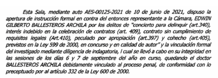 La Sala Especial de Instrucción de la Corte Suprema de Justica, mediante elAuto AES-00125-2021 , dio apertura de instrucción formal en contra de Ballesteros por los delitos de concierto para delinquir, interés indebido en celebración de contratos, contrato sin cumplimiento de los requisitos legales, peculado por apropiación y cohecho.
