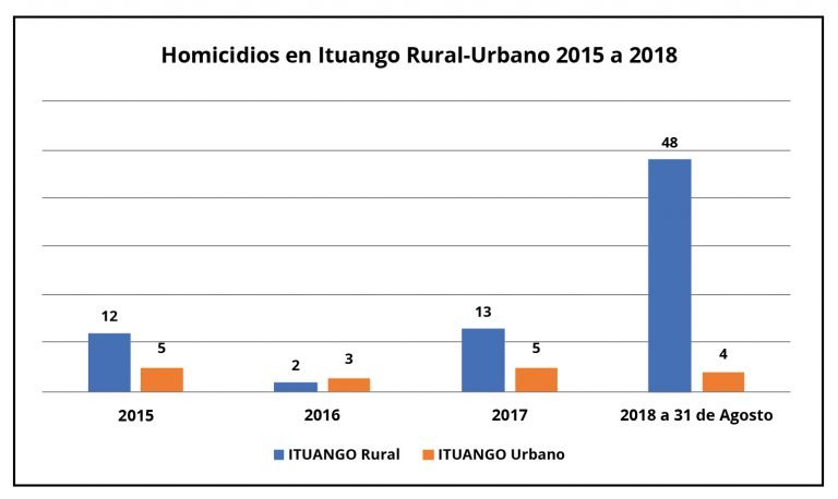 En Ituango tiene presencia un grupo postFARC autodenominado Frente 36 al mando de alias ‘Cabuyo’. Este grupo ha entrado en confrontación con el Clan del Golfo y durante el 2018 se han enfrentado en múltiples ocasiones, generando un aumento notable en las tasas de homicidio del municipio.