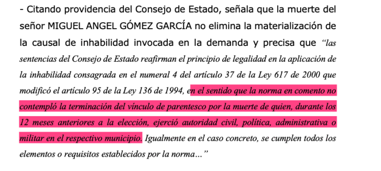 El problema jurídico reside en determinar si la muerte de Gómez padre acaba con el parentesco y, por consiguiente, con la inhabilidad de Gómez hijo. Según el concepto que retoma el demandante del Consejo de Estado, el parentesco no se extingue con la muerte y no se habían cumplido los doce meses anteriores a la elección que deben pasar para que un familiar inscriba una candidatura. La Resolución No 2456 DE 2021 expone que solamente se cumplieron diez meses y trece días desde el deceso de Gómez García hasta el día de las elecciones.