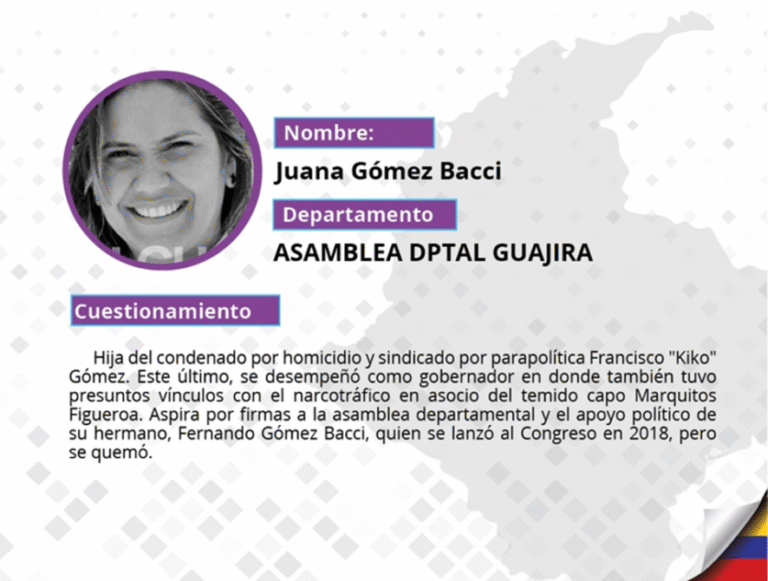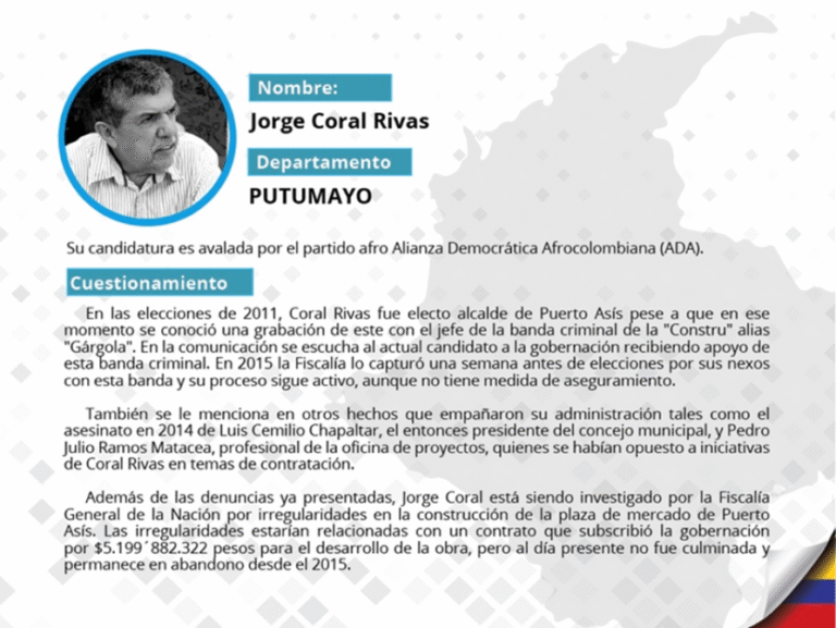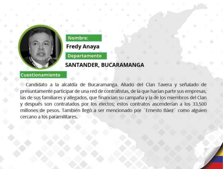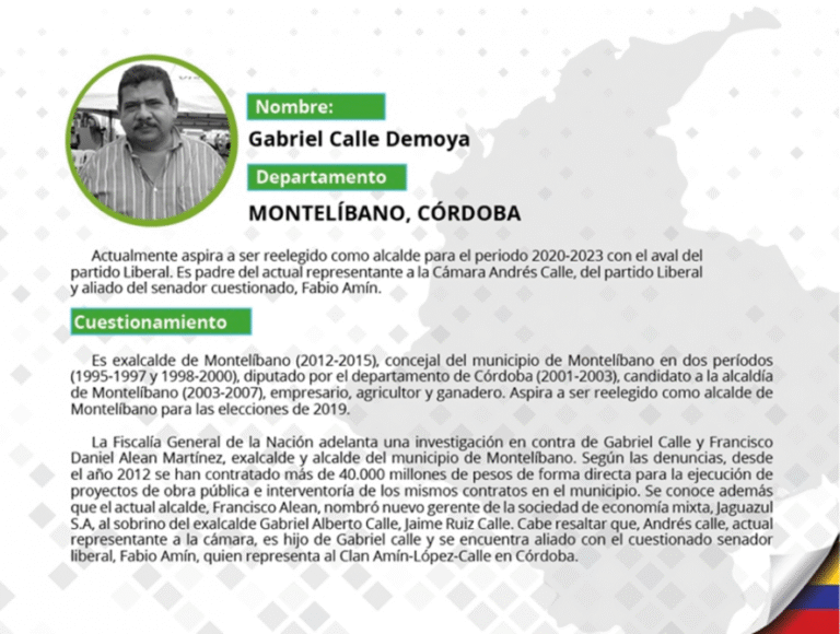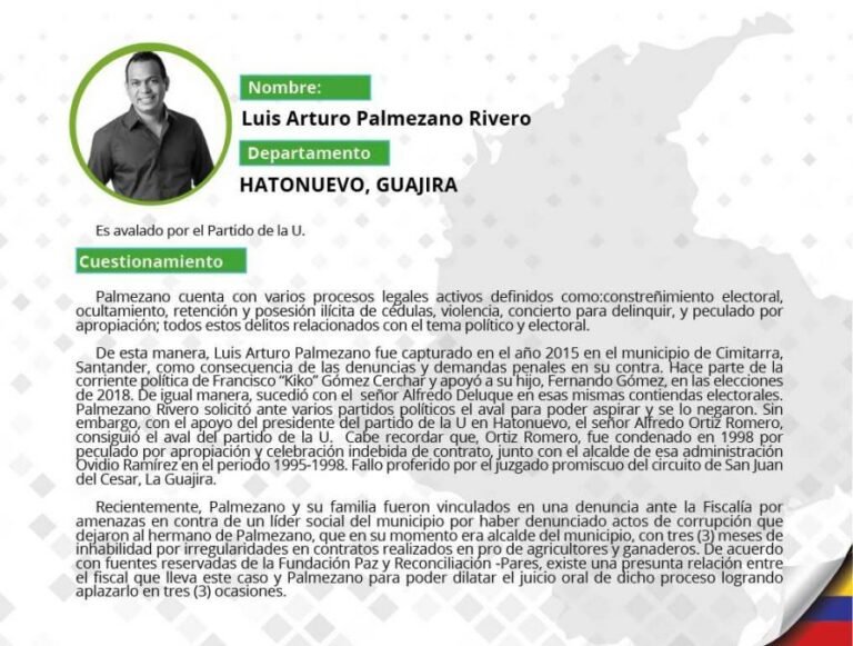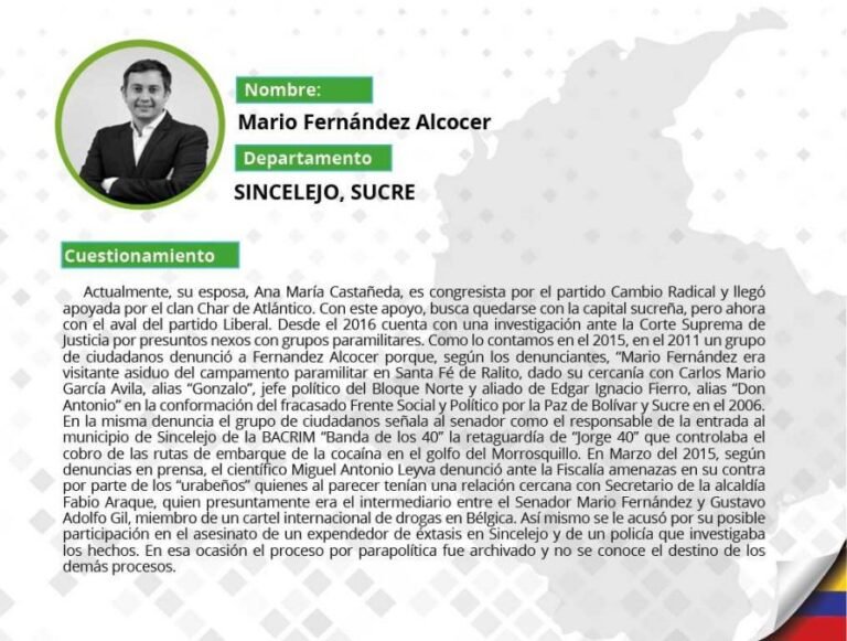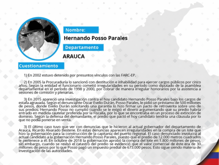 A continuación Pares selecciona los 10 candidatos más representativos de esta lista por categorías: Corrupción, Parapolítica, Vínculos con fuerzas ilegales e Impunidad judicial. Además, presentamos la lista de cuestionados por partido político y por departamento.