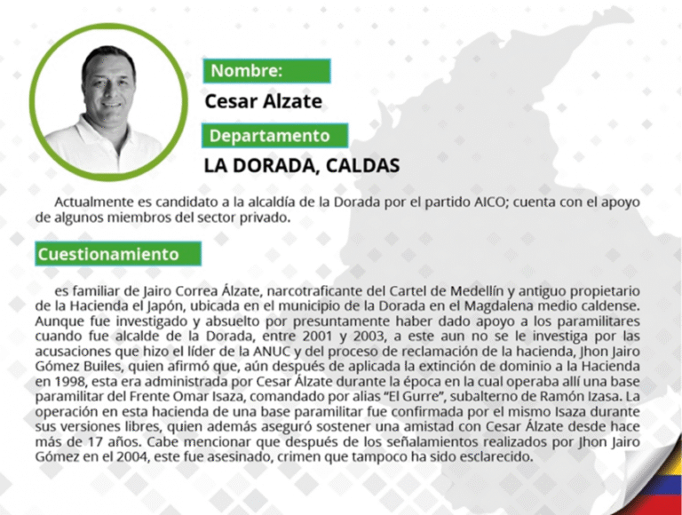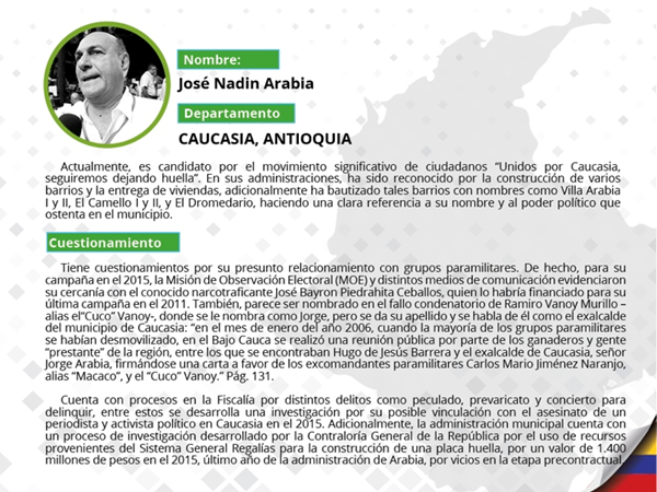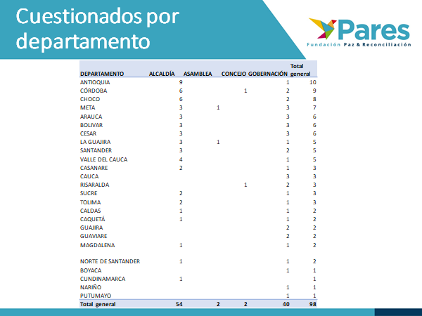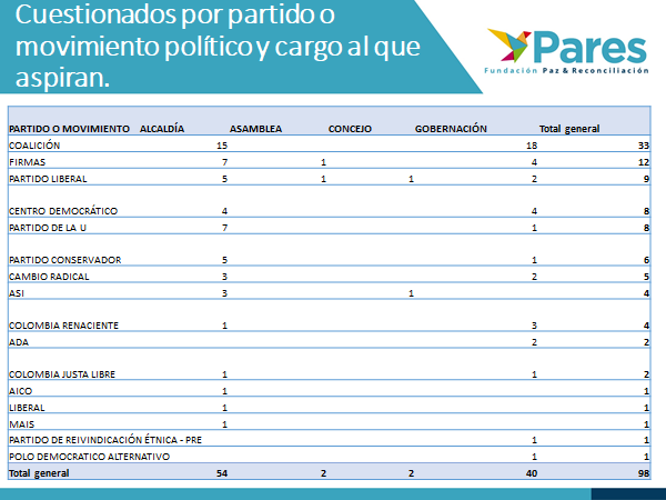 En total, son 98 candidatos cuestionados resultado de una primera indagación realizada por la Fundación Paz y Reconciliación -Pares. Aparecen como los más cuestionados por tener en su hoja de vida la herencia de la parapolítica o por presentar alguna relación con fuerzas ilegales. Esta es la conclusión a la que llega Pares después de monitorear a 236 candidatos a gobernaciones y alcaldías en 27 departamentos, así como tres (3) casos excepcionales a concejos y asambleas departamentales.