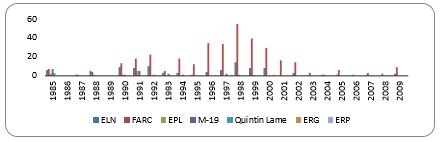 Por último, durante este período las FARC pusieron en marcha dos estrategias militares, por un lado “la nueva forma de operar”, que significaba la movilización de grandes contingentes de tropa y la toma a cabeceras municipales. Decenas de municipios del país fueron destruidos durante estos años. La siguiente gráfica muestra la evolución a las cabeceras urbanas del país.