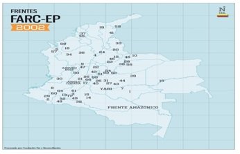 El punto más álgido de este esta estrategia fue la toma a Mitú en el año de 1998. La otra estrategia fue la de “vacío de poder” la cual consistió en la eliminación sistemática de autoridades políticas, secuestros, atentados y homicidios que se desarrollaron en las zonas de presencia de las FARC. Mientras los paramilitares se dedicaron a aliarse con políticos, las FARC se dedicaron a destruir al Estado colombiano. Para este momento se inician los diálogos de paz del Caguán y las FARC llegan a su punto más alto de poderío militar. El siguiente mapa muestra la presencia de las FARC para el año 2002 cuando contaba con algo más de 18 mil miembros en armas.