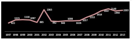 Evolución anual de las acciones de las FARC- 1997-2013.