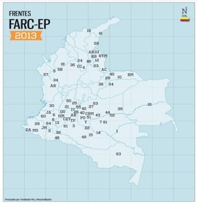 Nótese en el gráfico como el punto de quiebre se dio en los dos últimos años de la administración Uribe. La conclusión es que el total de acciones se incrementó, pero el tipo de acciones cambió, es decir se pasó de grandes ataques a cabeceras urbanas a ataques más dispersos y letales. El siguiente mapa muestra la presencia de las FARC para el año 2013.