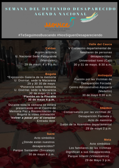 Para este año, los departamentos de Caldas, Valle del Cauca, Antioquia, Atlántico, Meta, Sucre y la ciudad de Bogotá, en donde el Movice hace presencia, estarán liderando actividades entorno a la conmemoración de las víctimas y exigiendo que esta práctica no se vuelva a repetir en Colombia.